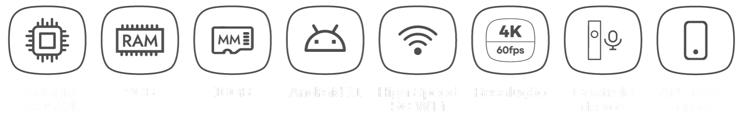 Dentre as novidades que tornarão sua experiência ainda melhor estão: o CPU de ponta, Android 11, WiFi Dual band, Bluetooth, e também: Controle por voz, para navegar rapidamente pelos canais, filmes, séries, configurações e aplicativos da sua TV box.